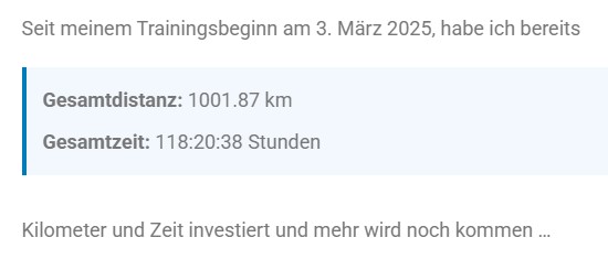 heute endete meine 25. Trainingswoche. Somit habe ich seit dem 3. März 2025 bereits 750,16 km Trainingskilometer absolviert und 90 Stunden 25 Minuten 57 Sekunden Zeit dazu benötigt.
