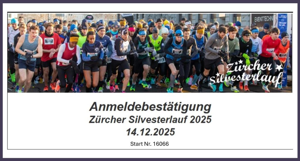 Nächsten Sonntag ist mein letztes Rennen für dieses Jahr, der Zürcher Silvesterlauf. Quer durch die Innenstadt von Zürich über 8,5 km. Dieser Lauf ist auch ein Volksfest, eine angenehme Ambiente und hoffentlich winterliche Temperaturen 🙂 Freue mich, die Saison gut abschliessen zu können und bleibe natürlich fokussiert auf mein Ziel, der Marathon Amsterdam 18.10.2026. Meine Start-Nr. ist die 16066 🙂
